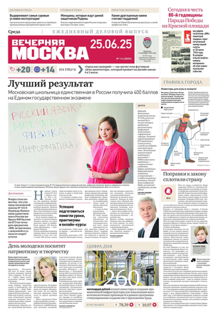 «Вечерняя Москва» — ежедневная российская вечерняя газета, старейшее из вечерних изданий в России, учрежденное в 1923 году. Выходит пять дней в неделю, кроме субботы и воскресенья. Отличается тем, что рассказывает о событиях еще не завершившегося дня. Оперативно освещает хронику и особенности жизни Москвы, охватывает все слои общества и большинство профессиональных и возрастных групп читателей.Издание представлено тремя выпусками – утренним ежедневным, вечерним (выходит три раза в неделю), еженедельным (выходит по четвергам).